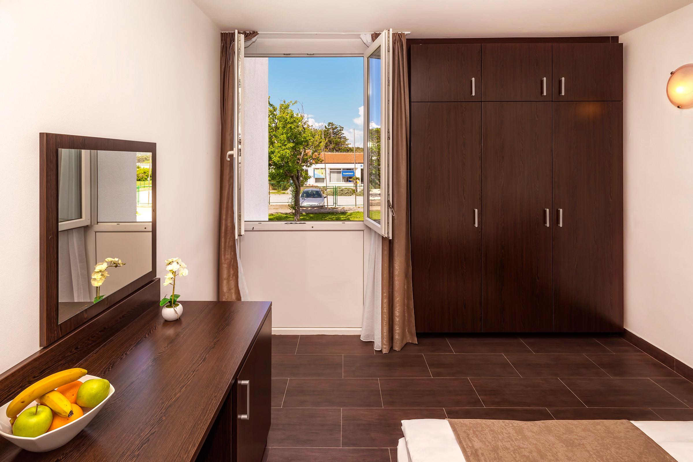 krevet 200x180 cm, telefon, grijanje, klimatizacija, LCD TV 80 cm, satelistki programi, stolica, fotelje (u nekim smještajnim jedinicama), ormar, odlagalište za putne torbe, hladnjak, dječji krevetić, pribor za šivanje